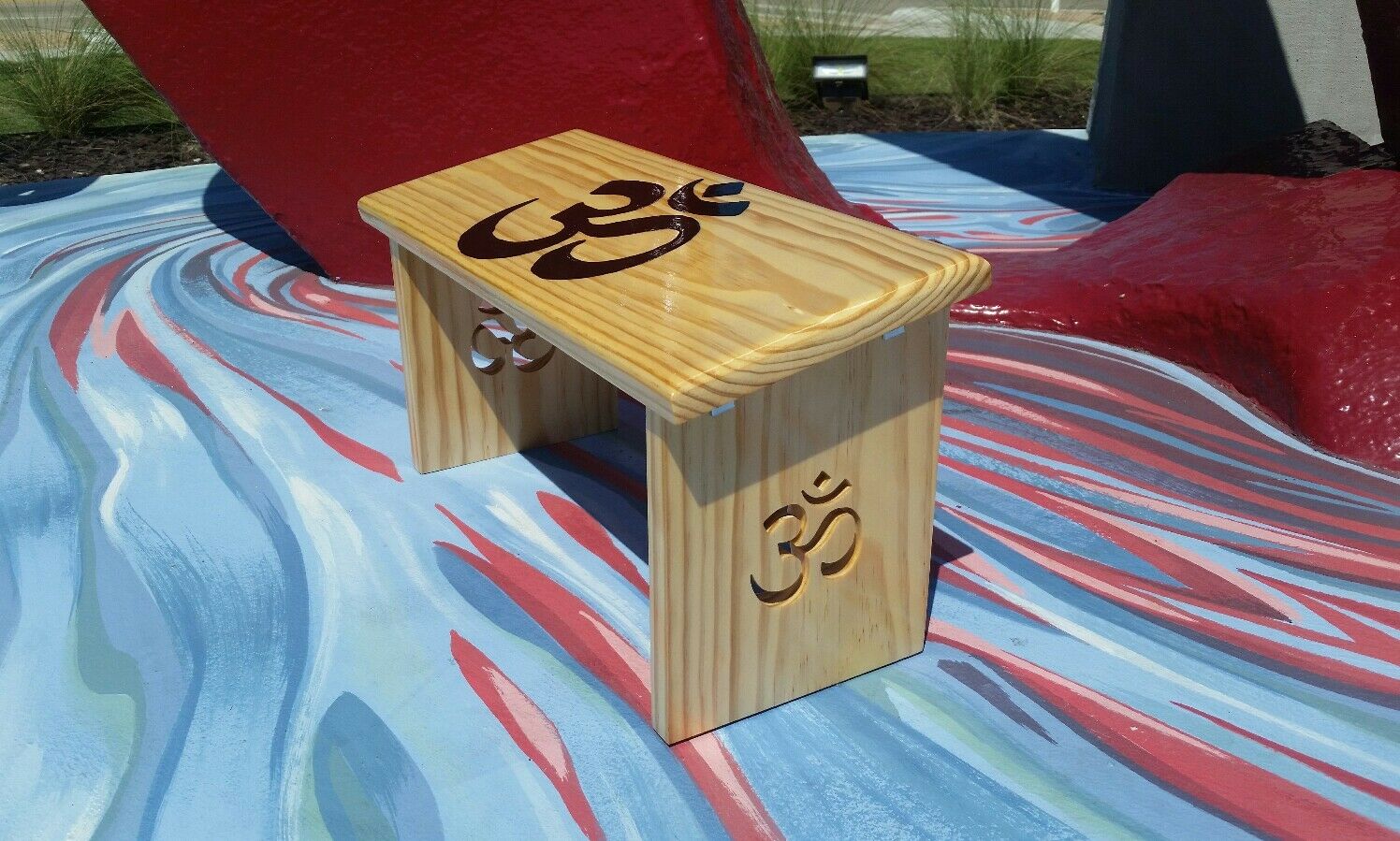 Hand Crafted Natural Finish Meditation Bench with Hand Painted OM and OM Legs